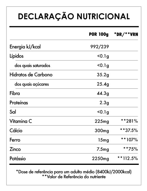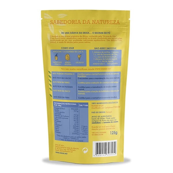 O embondeiro, de onde deriva o Baobab, é uma árvore notável, nativa de África, muitas vezes referida como “A Árvore da Vida”. O fruto amadurece e seca na árvore, produzindo uma incrível polpa, transformada em pó, com qualidades nutritivas extraordinárias. Tem alto teor em vitamina C e ferro, sendo excelente para reforçar o sistema imunitário, pois o último ajuda a fixar o primeiro no organismo. O Baobab é também rico em fibras solúveis, que contribuem para um sistema digestivo saudável e para equilibrar o nível de açúcar no sangue.