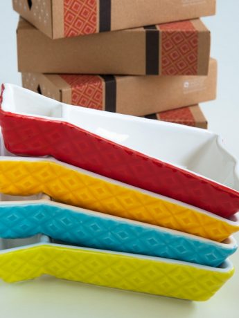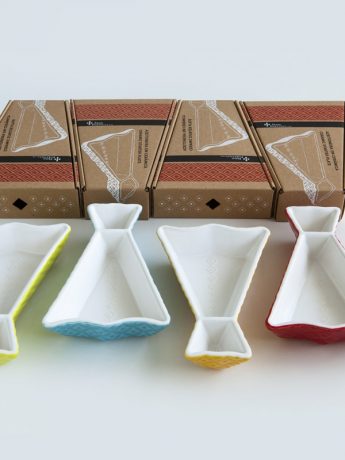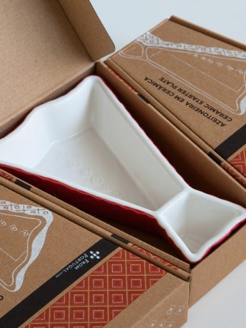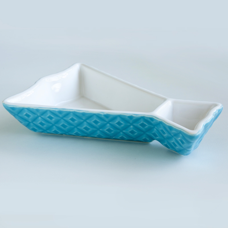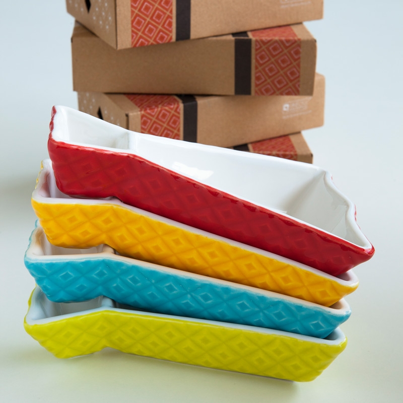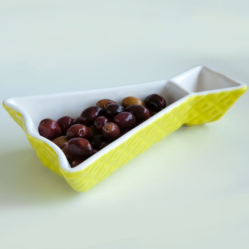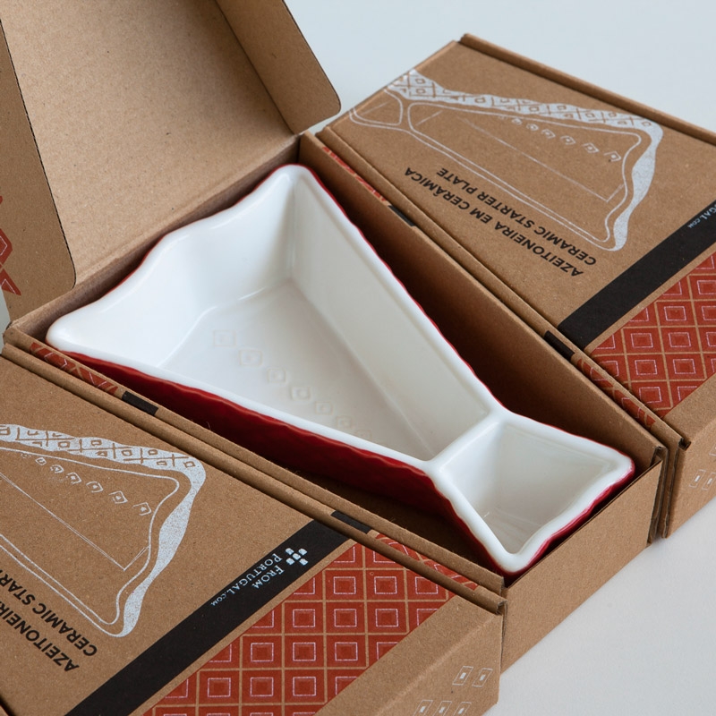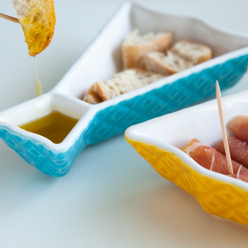 These original and colorful starter dishes were inspired on the portuguese cod fish. They are made of ceramics and are decorated with a colored glaze. Small details beautify these lovely pieces. You can serve olives or any other kind of appetizers, especially those that have sauces to go along. It is wash machine friendly and each piece is packed on an individual printed gift box.